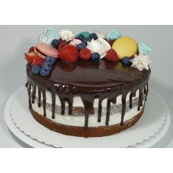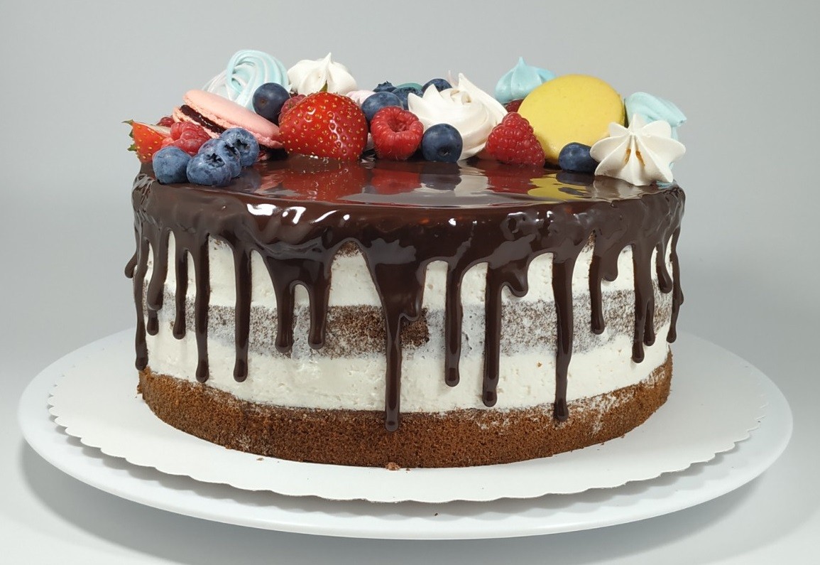 Bezlaktózový vanilkový semi-naked FULL TOP dort je naší další novinkou. Jedná se o nadýchaný čokoládový korpus, jemný a lehký bezlaktózový vanilkový krém a uvnitř plné kousků čerstvých jahod, malin a borůvek. Celý povrch dortu je zalitý delikátní hořkou čokoládou a dozdobený čerstvými jahodami, malinami, borůvkami, sněhovými pusinkami a makronkami. Tento tradiční rustikální design s elegantně dozdobeným povrchem Vás nenechá v klidu. Šťavnaté, lehké a k nakousnutí, to je naše další hitovka mezi dorty.