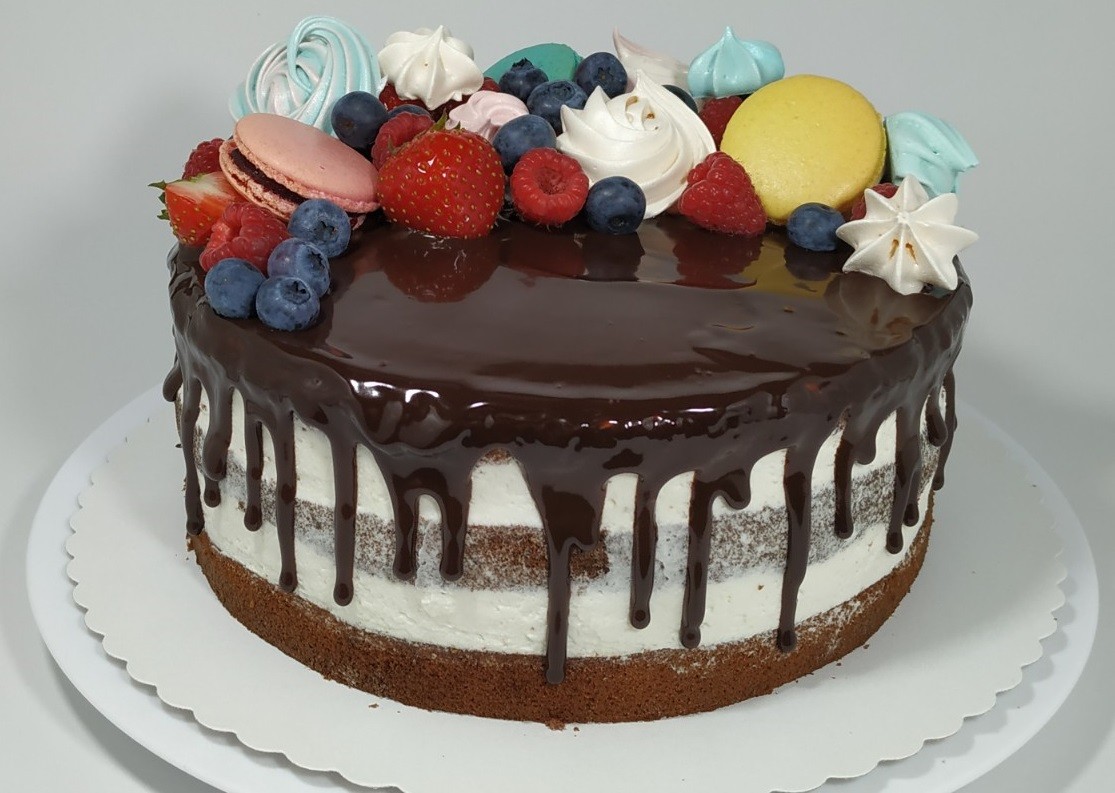Bezlaktózový vanilkový semi-naked dort s makronkami, pusinkami a čerstvým ovocem  FULL TOP